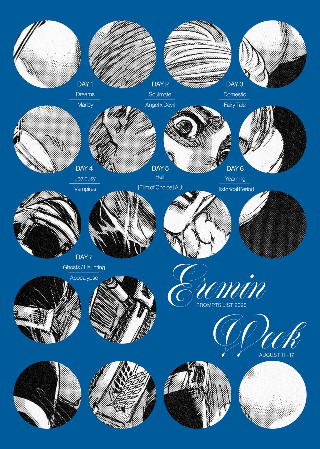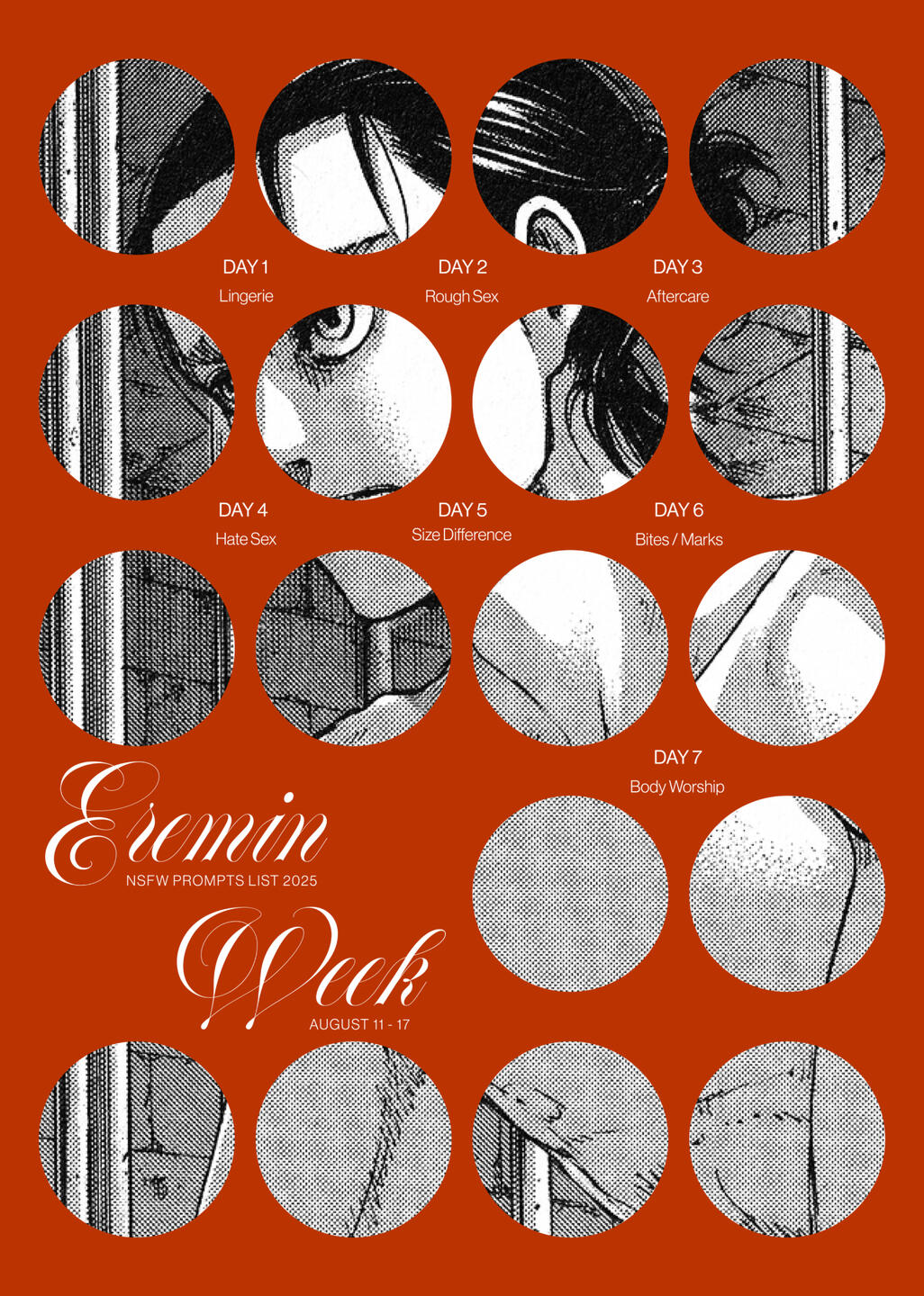 For each day of Eremin Week a variety of both SFW and NSFW prompts have been provided. With two SFW prompts, as well as one NSFW prompt to select from and use as inspiration.Generally participants are to select a singular prompt for each day of the week.They are then encouraged to produce a piece of creative work (fanart, fanfiction, cosplay etc.) based off of the prompts the individual has chosen.When the week officially begins on August 11th, participants then post each work one by one according to the days the prompts have been allocated to until its conclusion on the 17th.